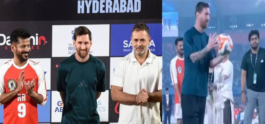 Lionel Messi Hyderabad Event: 13दिसंबर को फुटबॉल के दिग्गज लियोनेल मेसी की GOAT इंडिया टूर 2025की दूसरी लेग ने शहर को उत्साह से भर दिया। कोलकाता में हुई गड़बड़ी के बाद यहां का इवेंट सुचारू रूप से चला, जहां मेसी ने कांग्रेस नेता राहुल गांधी को साइन की हुई अर्जेंटीना जर्सी गिफ्ट की और तेलंगाना के मुख्यमंत्री ए. रेवंत रेड्डी के साथ फुटबॉल खेला। राजीव गांधी इंटरनेशनल स्टेडियम (उप्पल) में आयोजित इस कार्यक्रम में हजारों प्रशंसक जुटे, जहां मेसी ने युवा खिलाड़ियों से बातचीत की, ऑटोग्राफ दिए और फ्री किक्स भी मारे।